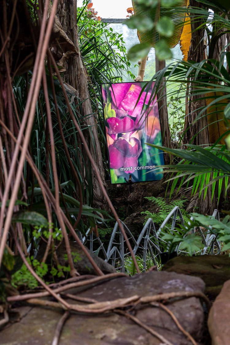 There are three other works, too. There is a sound work, adapted from an older work, You Used to Call It Blue Sometimes (2022), in which Akhavan collages the recorded reactions of people with colour blindness when they are shown the world of colour as the rest of us experience it, thanks to donning chromatically adjusted glasses. This 20-minute audio clip is supposed to be listened to as you go from the house through the garden (which was, in late spring, a riot of colour, it being peak rhododendron season) to a striking glasshouse pavilion, in which he has also placed a companion piece: chromatically enhanced film is layered over some of the glasshouse windows, which skews your perception of colour all over again.