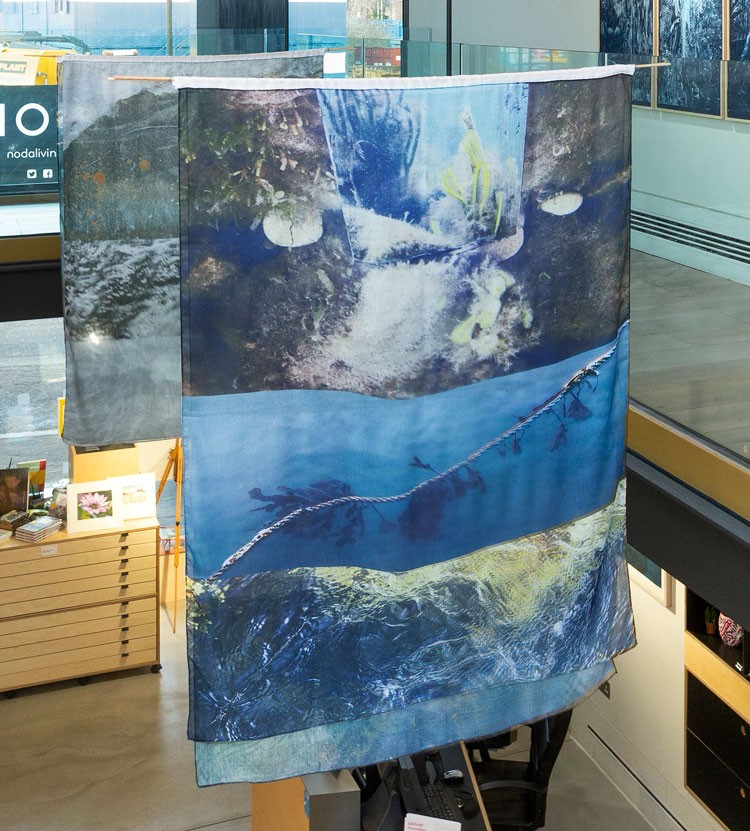 Also exploring and reflecting on process itself and its relation to everyday life, Marysia Lachowiz creates cyanotype and digital image constructions printed on to large sheets of muslin cloth that are suspended from the ceiling and drape down between levels of the building. These strikingly beautiful works are rooted in a methodology of mark-making as a way of connecting to one’s physical environment. Here, Lachowiz has drawn inspiration from her walks along the Fife coast creating impressions of that environment, reflecting on the power and destructiveness of the sea, and therein its sublime beauty, as well as the inherently transitory and changing character of the coast, as it breaks down and erodes over time.