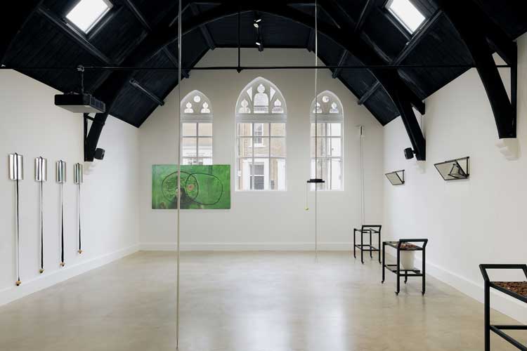 Aki Sasamoto, Grilled Diagrams, 2026. Installation view, Studio Voltaire, 2026. Commissioned and produced by Studio Voltaire. Image courtesy of the artist, Bortolami Gallery, Take Ninagawa and Studio Voltaire. Photo Sarah Rainer.