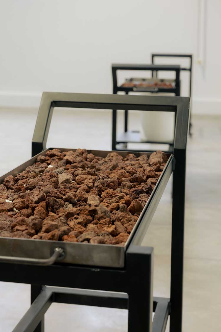 There is something idealistic in the phrasing, perhaps, although we don’t have time to contemplate its meaning, if it has one – soon she is herding her audience with the trolley, while seeming not to notice us. She parks it, heads to the wall where I am standing. High on this wall is a row of baking trays (like classical metopes), suspended from which are long pieces of black fabric, each held taut by a baking potato threaded at the end. The material turns out to be elasticated as she pulls on a potato (walking back from the wall, the audience moving around her again), lets it fly and crash against its tray, repeating the action along the wall. The messy absurdity garners laughs. Then she detaches the now-static forked pole and lowers it, manoeuvring about the room, milling us with her weapon as she says, “Dig, sift, sort” – what she is doing to her audience, perhaps. But soon she is drawing a winding river on another mirror, talking about (dug, sifted and sorted) rock formations, playing with blue transparent glasslike stones on one of the trolleys – which she later takes to the barbecue and cooks amid what looks like pancake dough. Hard and soft, heat-resistant and heat-reactive, sifting, sorting.