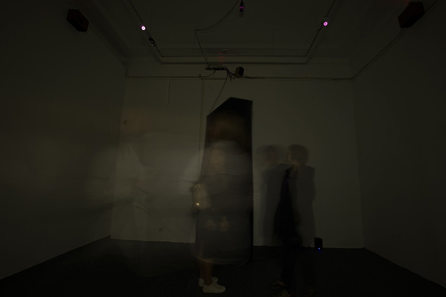 NK: Your installation Monolith (2010) is rather straightforward: it is about fear. The viewer enters a dark room, hears a menacing sound, sees a threatening shape that can suddenly jerk forward at them, and becomes frightened. I was scared to be in the room with Monolith. Next to it is Cycloramadrome (2014). What is it all about?