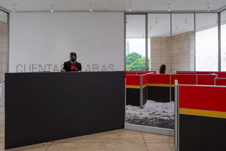 Then I did this other work, called the Bureaucratic Obstacle. This was at the Jumex Museum [in Mexico City in 2023]. I built a very simple labyrinth out of office partition walls – the ones that are covered in fabric and slotted together. The museum guards become the guardians of the labyrinth. At the entrance, you have a guard who gives you a form to fill in. The form is really absurd. It says things like: “Please tick one of these boxes and there are 25 boxes that you could tick. And then the guard could pick on you and make you fill out two or three forms. A queue would form, a line of people wanting to go in. As soon as your form was accepted and you were allowed entry to the labyrinth, they would just shred the form in front of you and it would fall into the labyrinth which was full of shredded paper. And the shredded paper was the dead archive of Jumex, the corporation. But then, inside the labyrinth, people used the shredded paper as confetti and were having paper fights. So, it became festive, joyful.