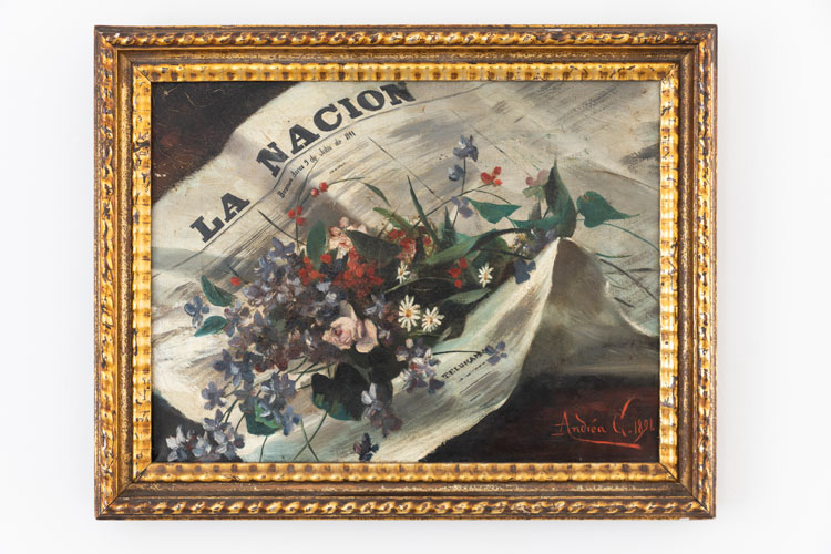 AP: Yes, a painting he found in a car boot sale. The painting is a bunch of British flowers, which look like wildflowers, but they are wrapped in newspaper, almost as if they have been wrapped and opened. The newspaper is [Argentinian daily] La Nación. But the painting shows the date 9 July 1891 on the newspaper, 9 July being the day Argentinian independence [is celebrated]. So, it’s one of these patriotic symbols. The painting itself is dated 1891, and the signature is Andrea G.