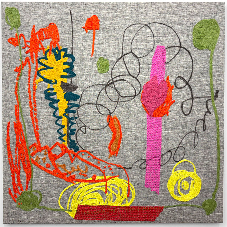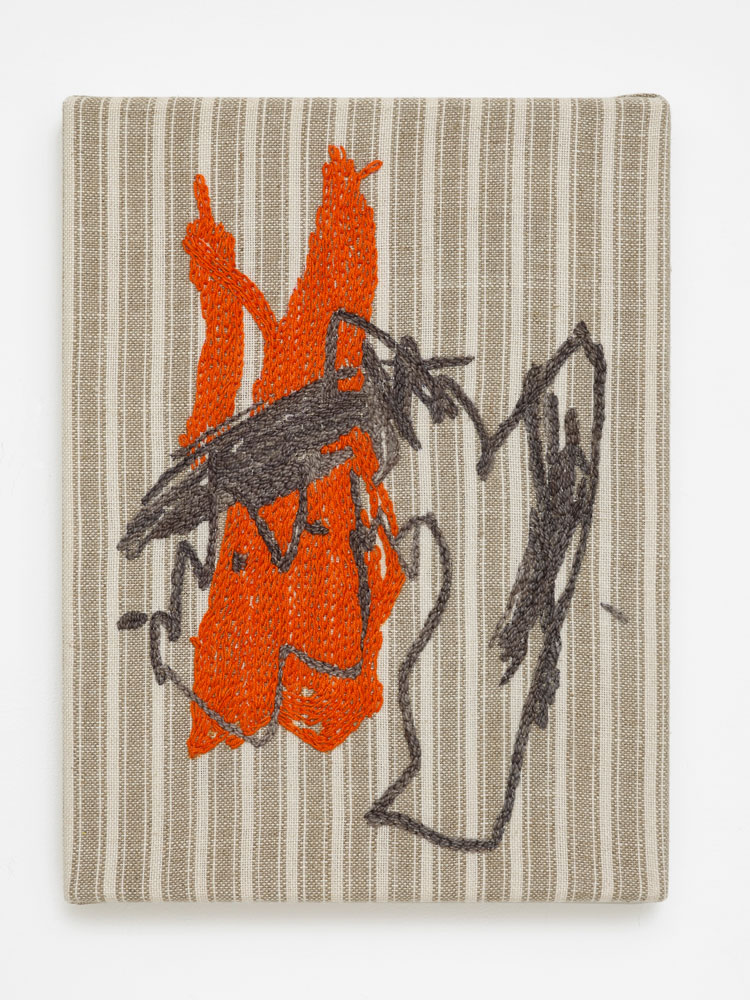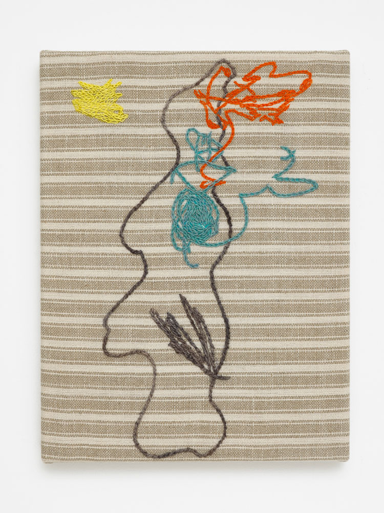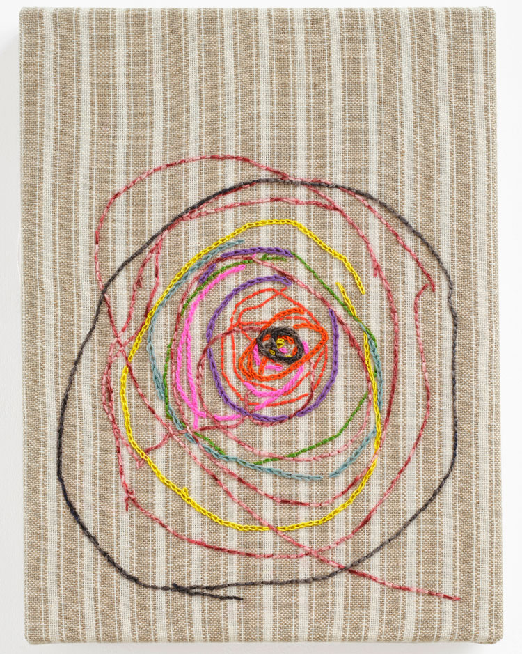 AP: They are new, for Cample Line. But it’s a series I started maybe a year and a half ago. Because my work is so varied, there used to be more anxiety on my behalf about how things fit together, but now one of my strategies is to bring something I’m already making to meet that new space. The embroidery is quite large. It’s hand-embroidered. And there are a few smaller studies. They are based on drawings that my son made just before he started to draw “pictures”. With my background as a primary school art teacher, so much of my work was to deconstruct the way kids draw things as they think they should be: the House, the Tree. And probably their houses or trees don’t look like that to them, they’ve just learned this short cut to how to draw something. I was very attached to these pre-representational drawings, because I knew what was coming. But, at the same time, there’s this disparity between the speed of the marker – literally how little time it took him to make (the image) – but also how it moves. And then there’s this stitch, which is a very controlled action. I think they have that tension. When you see them from afar, they look expressive, but as you get closer, they are so detailed and painstaking.