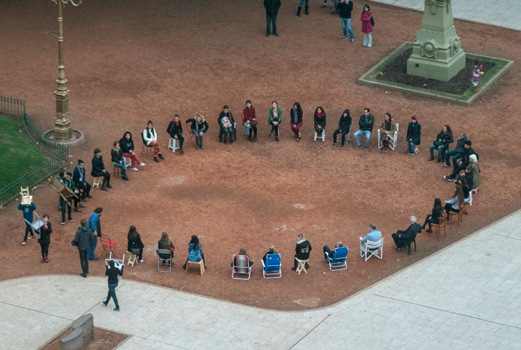 In Amsterdam, she expanded her practice to explore commonalities and conflict in the collective consciousness around everyday symbols and signifiers. Bunting cropped up early – appearing in a performance work she devised for the Venice Biennale in 2011. Together with festoon lights, it also appeared in her solo show at the Chisenhale gallery in 2012. Chairs have also made a few appearances: in fact, I first encountered Pica’s work in 2016, when the South London Gallery invited its local community to take part in her public performance work Asamble, which requires local people to congregate, bringing a chair from their home, to form and then disrupt circles of gathering in public. The work explores the politics of community. And those politics resonate quite differently, across the three places it has been staged: first outside Argentina’s House of Congress in Buenos Aires, and then, in 2015, at New York’s Guggenheim Museum.