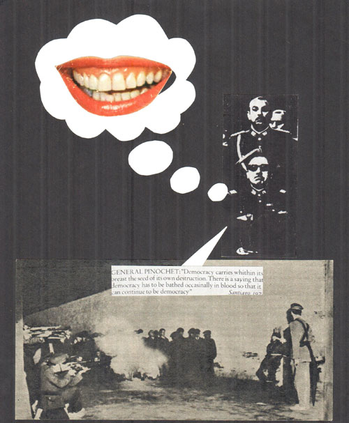 The disruptive inventiveness of artists faced with terror and enforced silence recurs throughout América Latina. Centering on the continuing abuse of power and its effect on the abused, the collages of another Chilean, Eugenio Dittborn, managed to bypass the authorities and embargos by being distributed as “airmail paintings” via international mail. In Brazilian Anna Bella Geiger’s História do Brasil: Little Boys & Girls (1975), an observer is portrayed as a blinded voyeur, bereft of colour in comparison to the vibrancy of the featured natives. Recalling the Weimar Dadaists, Chilean Guillermo Deisler’s photomontage Untitled (1977-79) is a powerful, incongruous mix of barbarity and style, with a daydreaming Pinochet casually pondering a firing squad. It contains a reminder in direct quotes of the general’s contempt for democracy, which resonates given that he was supported by the world’s leading democracy. In Claudia Andujar’s Marcados Para series (1981-1993), the Brazilian photographs the often forgotten victims of man’s inhumanity to man, the native American population, with numbers hanging around their necks. Here, context is everything. It is almost impossible to view the photographs and not think of the Holocaust and, particularly, the photos of the Khmer Rouge victims from Tuol Sleng. Alongside the Argentinian Oscar Bony’s similarly emotive Suicidios series (1998), they are a chilling reminder that for every genocide we reel from, there are others that have taken place definitively in secret. At other times, faced with the obscenity of violence, the cry of defiance becomes a harrowing shriek.