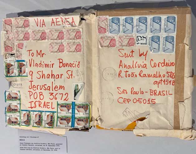 Letter sent by Analivia Cordeiro to Vladimir Bonačić, 1974, installation view, From Body to Code, ZKM (Centre for Art and Media), Karlsruhe 2023. Photo: Bronac Ferran.