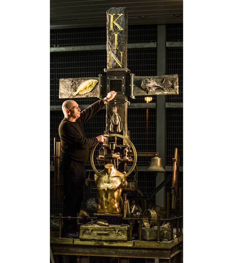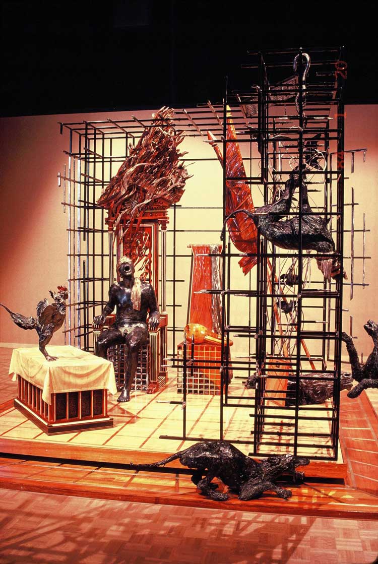 For Kinghorn, Australia provided great opportunities, where experimental culture was encouraged, due in large part to the Sculpture Triennials. The Mildura Sculpture Triennial ran from 1961 to 1978, when it evolved into the Australian Sculpture Triennial in Melbourne in 1981, 1984 and 1987. It was an unprecedented initiative that enabled extensive and diverse showcasing of experimental works, earthworks and landscape art, across various venues and institutions. Kinghorn’s audacious installation In the Shadow of the New Republic (1982) shown at the Second Australian Sculptural Biennial in 1984 is a complex work that operates on several levels. Conceived in response to personal distress and disillusionment, the scale and ambitious structure convey the verfremdungseffekt of a Brechtian theatrical piece. Alienation and deep conflict are presented to define a paradoxical, existential stance. The artist cites Francis Bacon and George Orwell as the inspirations for the dystopian piece. Just as Bacon achieves an unexpected affirmation through the choice of formal language – the precision and care applied to the creative act, Kinghorn’s placement of each human or animal figure, the respective crafted materials, achieves a lasting resonance and theatricality. The amplification of a personal experience to a universal message is due in large part to the dialogue he has with art from the past, and a desire to challenge the Eurocentric cultural hegemony. In 1983, the Scottish artist John Bellany, whose expressionistic, audacious paintings challenged the prevailing conceptual or abstract work in Britain, was invited by the Dean, John Walker, to spend a year at the Victorian College of the Arts, in Melbourne. This was a febrile moment for young artists that led to work of great commitment. In 1983 and 1986, Michael Spens, then editor of Studio International, published two special issues dedicated to the buoyant art scene in Australia.