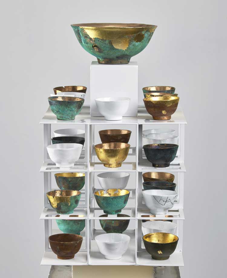 Kinghorn’s diverse practice has been characterised by dualism, religious belief systems and ageing. While his choice of traditional materials – bronze, aluminium and stainless steel – might align him with a traditional role of sculptor, he has interrogated cultural meaning with an iconoclastic modus operandi from the early 70s. In the Shadow of the New Republic, created in bronze, carved wood and steel, presents a haunting presence within a stage that is a metaphor for human society. Forty-three years on, Kinghorn mostly makes beautifully crafted small tableau, where cast forms of teacups or rice bowls assert the individual pitched against societal forces, the unbearable state of world politics, personal anxiety in the world of immense threat and horror.