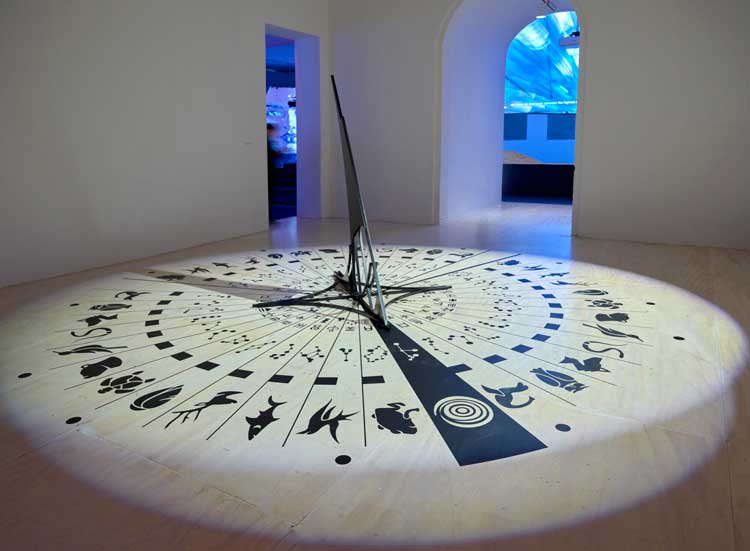 Ayoung Kim. Delivery Dancer’s Arc: Inverse (detail). 2024. Three-channel video, lighting installation, random video playback and lighting synchronization control program, sundial sculpture, graphic sheets, and circular screen. Courtesy MoMA PS1. Photo: Roz Akin.