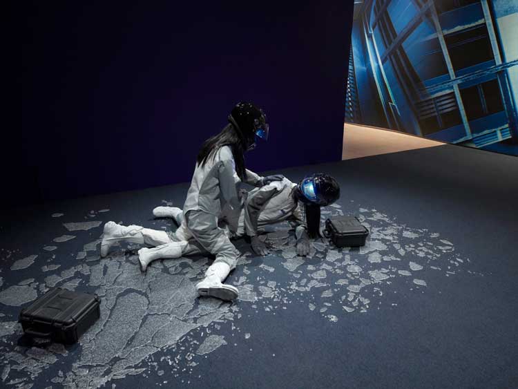 This dissonance of real and fictional, physical and virtual, lends the complete trilogy an intriguing ambiguity. Kim has said in interviews that she intends the Delivery Dancer works to continue, their endlessness mirroring the infinite options of AI itself, but the danger is that a multitude of films starts to feel as overwhelming as a multitude of universes, the ideas behind them a little too “meta” and experimental for a museum setting. What Kim manages to do so well in the first video, Delivery Dancer’s Sphere,is use mind-blowing, complex and seductive visuals and make us feel the speed of the sleek delivery driver, the chill from the cold cement of the highway, the glow of the warm lights in the surrounding buildings, the meeting of two lost souls amid the desolate rows of stacked boxes in an anonymous warehouse.