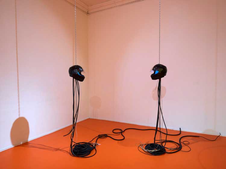 Ayoung Kim. Ghost Dancers A. 2022. Helmets, video, tablets, wire, corrugated tube, and metal chain. Courtesy MoMA PS1. Photo: Roz Akin.