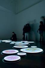 The entrance to Decode: Digital Design Sensations is a dark dream like path lined either side with what appear to be long bulrushes. Dan Roosegaarde’s Dune (2007), reed beds of bright white LEDs, are triggered by movement, they flicker and chirrup. You can’t help but stretch out your hand to disturb these long wavy lights, a modern day “fingers dragging through long grass” sensation. Some exhibits directly reference antique toys. C.E.B. Reas’s TI (2004), six circular floor projections uses “Processing”, an open source program environment to construct his continually changing images. Visually they are kaleidoscopic, the pattern growing from a central point remind me of the late Shelagh Cluett’s digitally manipulated mosaics, fractured details composed into waves.6 Digital Zeotrope (2008) is an extraordinary spinning barrel, commissioned by the innovative onedotzero, and made by the collaborative Troika.7 I can’t understand how this modern day magic lantern works. The lit drum is spinning, and there are lines of type projected from the inside, also spinning at different speeds from each other. There is no physical interaction with this work but it is mystifying and triggers many cinematic connections.