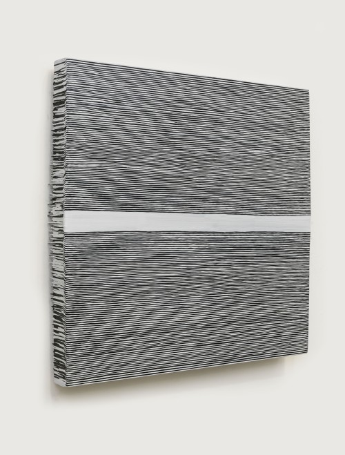 Beijing Commune showed the work of Wang Guangle, an artist born in 1976 in Fujian Province in China, whose abstractions spin off western modernism, but add to it a distinctly meditative quality. His black-and-white striped acrylics on canvas, for example, emphasise the physicality of the process of layering the paint, its thick consistency, and the lack of precision that paint can create. Unlike Frank Stella, a pioneer of object-oriented striped art, Wang Guangle arranges paint in layers, one on top of another. The resulting lines are uneven, but not faulty, cascading neatly, albeit inexactly, from the top of the canvas towards the bottom, stopping a couple of inches from its edge. The sides of the canvas are also exposed to bring the viewers’ attention to the natural messiness of the painting process. The picture plane as such is abolished; instead, we have a canvas stretched, but its edges accentuated. As they turn the corner, the neat strips blend together into indistinguishable clusters, accentuating the artificiality of order that painting imposes on the world.