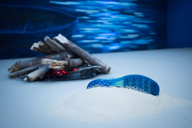 The rhythmic sound of swooshing waves entices you into the gallery and past two large and very artificial-looking sand dunes, topped with tall grasses, delivering you into a moonlit beach scene rendered with just enough skill to be convincing, but not so much as to detract from its broad-brushstrokes theatricality. There is midnight-blue paint on the walls, and a roughly rendered light-box sea ripples with moonlight shimmer from a cartoon full moon painted above it. A crackling fake bonfire completes this pseudo-idyllic beach setting, while from a nearby discarded trainer, gently glowing by the fire, we hear the soft but insistent tones of a female voice singing a Welsh folksong. The curious and the kitsch combine to create Williams’s off-kilter world.