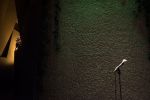 After the affluent cocoon of the black boardroom, we are thrust into a gloomy, green-lit gulley that cuts in over our heads. We are forced to walk below a stuffed goat standing on a ledge, which stares balefully ahead out of glassy, marble eyes, waiting to be provoked – like some hairy heckler – by anyone brave enough to stroll up and speak or sing into the nearby solitary, spotlit microphone, and in so doing, triggering the goat’s interjections.