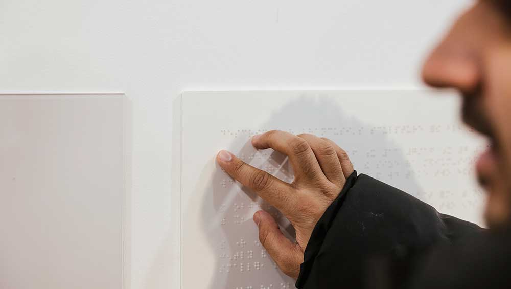 The work that really sums up the project, though, is Lenka Clayton’s Sculpture for the Blind, by the Blind (2017). The starting point for this piece was a sculpture by Constantin Brâncuși called Sculpture for the Blind. As Clayton explains: “I came across this sculpture … in the collection of the Philadelphia Museum of Art. And I’m a sighted person. I could see the sculpture, and I could see that it was in this big glass case. And when I heard the title, there was something extraordinary that it suggested to me that it was a sculpture titled for the blind, but it was displayed permanently in a way that it was completely inaccessible to anybody who would identify as blind.” She found this “confused logic” both “thrilling and fascinating and ridiculous” as well as “very demonstrative of the human condition”. Having tried and failed to get the Philadelphia Museum to loan the artwork, to allow it to be scanned to make a copy, or to allow it to be touched, Clayton wrote a description of the work and read it out in a workshop for blind and visually impaired people, who then made a sculptural form of what they understood. These waxed plaster pieces – completely unboxed and free to be touched – are what are on display here, along with a photograph of the Brâncuși and a Braille transcript of Clayton’s description – something this time able to be experienced only by blind and partially sighted people who have learned the script.