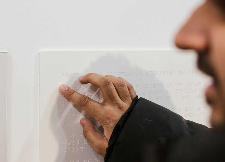 Similarly, one of Johnson’s two pieces, Inhibition: Beyond the Doubt of a Shadow (2025), a crude description of which would be a table and stools with chewing gum stuck to the underside, also smells strongly of peppermint (although I didn’t notice this until I was told, showing me how much I might be missing out on by not having all my senses tuned in). A more generous description notes that the “chewing gum” is silicone, and that the pieces are stuck on so as to spell out “inhibition” in Braille. Inhibition, Johnson notes, is the opposite of exhibition, and “the whole piece is about inhibited art. It’s about hiding it rather than exhibiting it. It’s out of sight. It’s invisible, inhibited and only available to touch.” Expanding on what he writes in his book chapter, Johnson continues, that, for a blind person, the underside of a table is just as prominent as the top of it. “So, I decided to put something there. I also wanted the ‘ugh’ factor,” he says laughing, introducing a playful aspect to the piece, which is otherwise designed to deliver a serious message around inclusion.