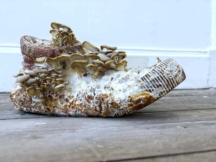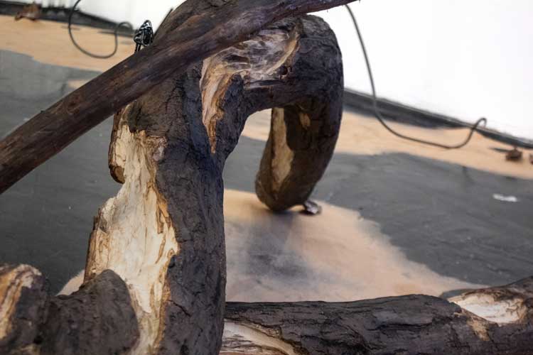 Materials with dystopian associations are transformed: “Sand surrounding the sculptures [implies] an unviable ecosystem, referencing expanding deserts or rising sea levels. Decaying and drying wood also hold dystopian elements, without leaves to signify life. But fungi that decays wood are a sign of a healthy lifecycle, of regrowth. Smaller, forged fungi in the sand invite you to look again, closer. These small details invite you to look closer, to shift the narrative away from a dystopian one into something else: there are signs of life in the sand.”