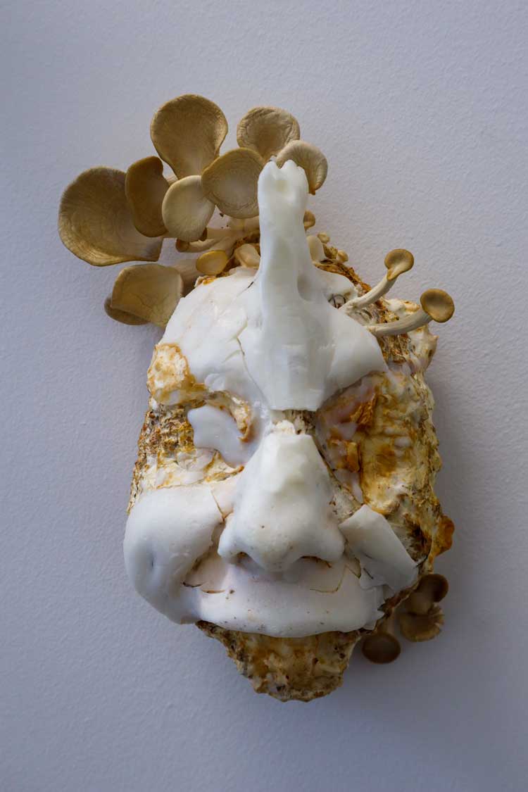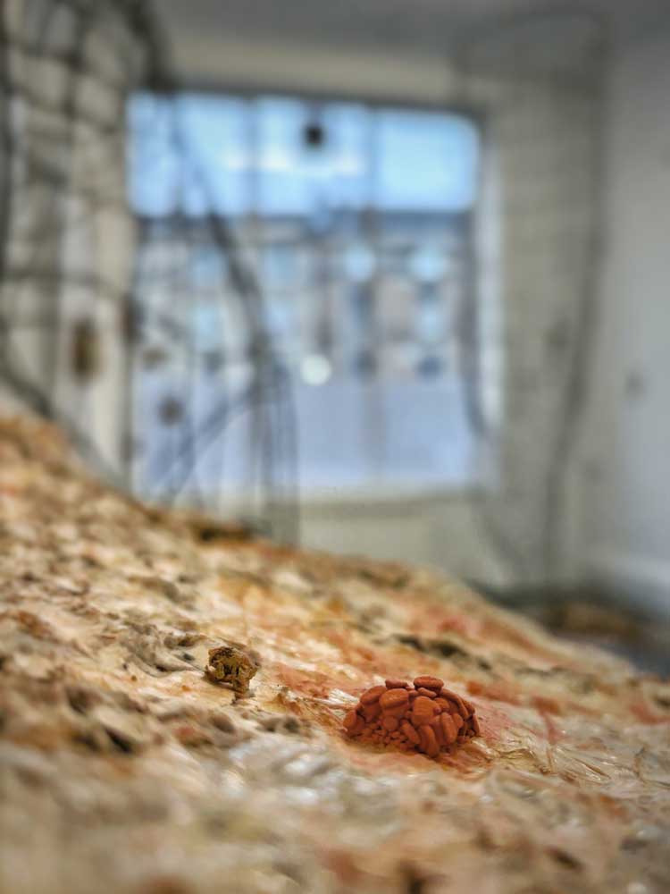 Positioning capitalism as a system that endangers all forms of existence Net Worthy exposes the devastation left by profit-driven food production; visiting her exhibition one experiences a sense of complicity in the aftermath of damage to animal life. Appletree is interested here in the beauty of destruction using materiality (mycelium, soya wax, sand and rhododendron petals) to conjure symbolic meaning through association – to compel her audience to engage with the reality of capitalist food production and the devastation it leaves in its wake. “Sand is a material most people will have a relationship with and it’s a significant feature of the Scottish landscape which many animals and organisms depend on for life,” she says. “It forms some of the seabed. On the darker side, it’s a symbol of desertification: a process by which our lands are turned infertile often due to overgrazing, overcultivation and deforestation. Here, I have formed the sand into faces, faces that look distressed. Rhododendron petals seem to be growing out of them: an invasive species in Scotland, a major contributor to biodiversity loss, particularly in the Highlands.”