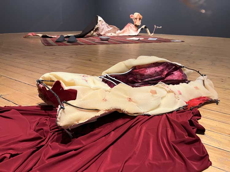 Any Body Home addresses the deep connections between violence against women and animals. Visceral installations such as Memorial to the Victims of Violence in Shared Spaces (2024) leave the viewer feeling uncomfortable, but it is also the manner through which we achieve the capacity for change. Oleskiewicz suggests: “I believe it’s mainly through grief that we can imagine a better reality. When I think of futuristic, utopian visions, they are built on mourning – and it is from there that we can move further towards building more sensitive communities. Rebecca Solnit wrote: ‘The past equips us to face the future.’” By creating commemorative monuments to any body, Oleskiewicz works to create empathy through memorialisation, by focusing on a body’s universal sentience of unjustified suffering. Her works are the very antithesis of those found in exisiting public spaces replete with traditional monuments, such as men on horses, that embody and reinforce patriarchal structures where grief is taboo.