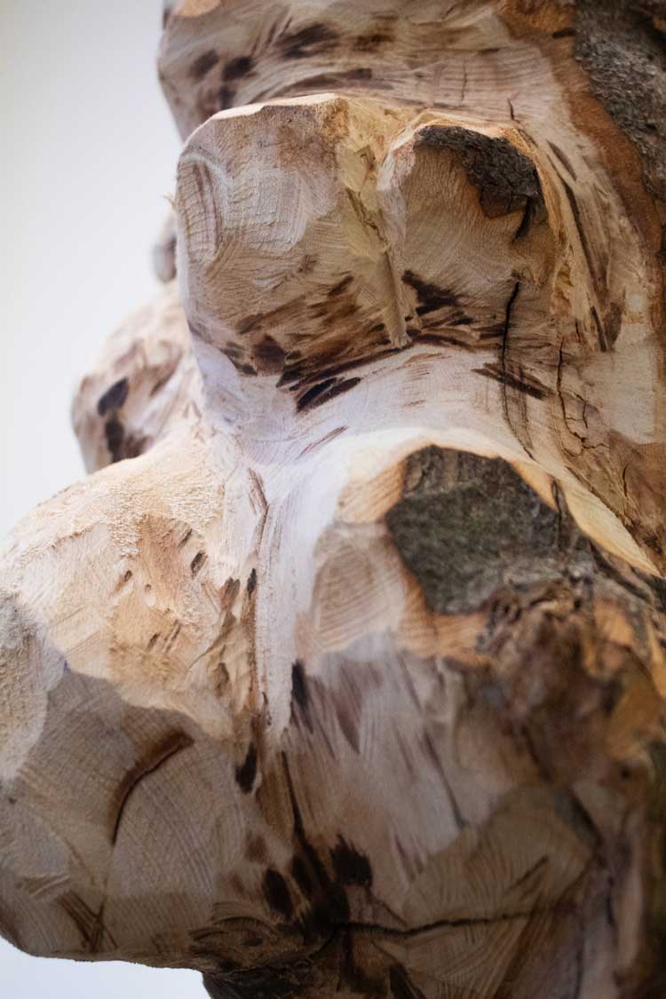 All Day, Waiting for Another Sun to Rise by Molly Wickett creates a post-apocalyptic landscape through a disabled and queer lens. Her carved and chiselled tree trunks push against the confines of the small gallery, creating a sensory experience of drama and tension due to the powerful forms that conjure decay. Yet, in blurring distinctions between dystopias and utopias, aspects of transformation show that regrowth can exist. The sculptural landscape reframes ecological breakdown as a site of hope.