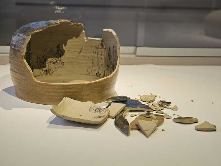 Concepts That Changed Deeply After Immigration consists of seven house-like structures, each dedicated to a concept written on the second anniversary of the artist’s immigration: Otherness, Freedom, Loneliness, Prosperity, Longing, Peacefulness and Grief: “Grief was the largest ceramic piece I made. I broke the piece before firing it because I think grief has two dimensions. One is the loss of something you deeply cared about, and the other is the loss of what might have been. By breaking the piece before firing, I denied myself the possibility of ever seeing what life could have become. Inside the fragments are drawings of landscapes of Iran, its nature, its cities and its people.”