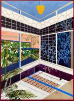 Charlotte Keates (b1990, Somerset, UK) makes paintings inspired by architectural spaces she has visited on her various residencies – some as far afield as Singapore, Japan and Bali. They depict empty houses – presumably someone’s home, but whose, it is unclear, since there are never any personal artefacts on show. Instead, Keates hopes viewers might seek to occupy the space, as they engage with what at first comes across as an architecturally realistic portrayal, only on closer inspection to reveal itself as a dystopian (or should that be utopian?) impossibility, with perspectives that don’t quite work, ladders that stop abruptly, and doorways leading nowhere. She wants the works to be like dreamscapes, depicting the memory and the feeling of a place, rather than the place itself.