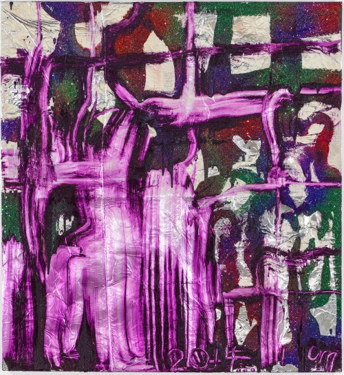 Walton, NY sits in the foothills of the Catskill Mountains, settled in a pine tree forest. Anyone who has ever spent time there, will recognise its powerful and mysterious presence in Chris Martin’s new paintings, many of which he created there, outside among the trees. In Chameleon (2014), pours of multicoloured glitter navigate their way across vibrant hues of yellow, orange and pink acrylic paint, lyrically evoking whispering winds, air-textured moss and tiny mushrooms. Stand before Untitled (2014), a giant canvas of glitter, silver leaf and swooping gestures of magenta-coloured paint, and recall the way in which light filters through the forest’s evergreen branches. The diaristic collage elements found in many of these works do not impose their personal narrative on viewers, but rather open up to one’s own encounter with the work, leaving room for subjective interpretation.