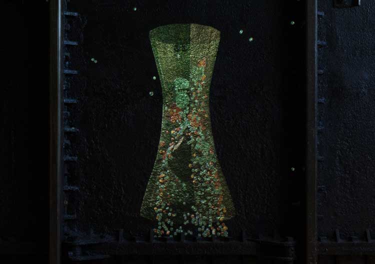 On the farthest trestle are heaps of pink sand from a beach in India, industrially used to cut knives. These are echoed in the final room – the rather fabulous Daskalopolous Tank Gallery – in which coloured materials, looking like Toblerone triangles, are piled up, sorted by colour, on the floor. Edible as they may look, these are, in fact, tumbling media, used for finishing and polishing manufactured parts in a rotating machine. They represent in solid form the particles in the four procedural animations projected on the scarred black walls. This backdrop has the effect of rendering the images ephemeral, twinkling as if made from foil chocolate wrappers. Sand running through a timer, liquid swirling in a flask, a cauldron-like vase with gold pigment being poured in – these animations appear alchemical and gossamer, at once industrial and magical.
