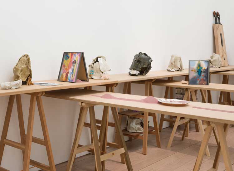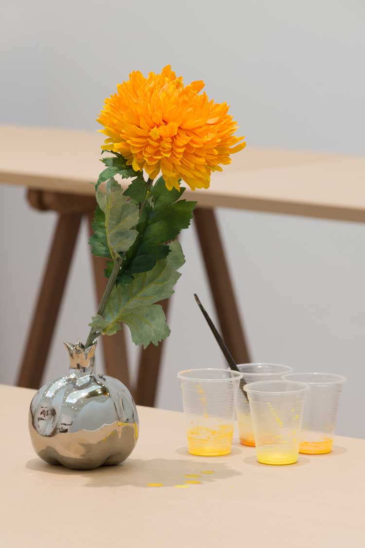 Pigment is important to Mackie, and in the Bridget Riley Gallery, a fabulous paint-drenched plastic marigold “drips” its colour into empty plastic cups beneath its petals. This is one of many disparate yet linked objects in the room’s overall installation, The Judges II (2011), which approximates Mackie’s studio, and which she describes as an “open system” in which “no one reading is dictated”. The installation was loosely inspired by a visit to the lava tubes of an extinct volcano in Australia, and the room also includes scientific illustrations of jellyfish, made up from thousands of tiny dots, which closely resemble the shape of the atomic cloud also pictured. Then there are several abstracted clay objects, which, if looked at closely, morph into human faces, reflecting the phenomenon of pareidolia – seeing faces in things – and echoing those Mackie saw in the petrified folds of magma. A series of Indian ink drawings – splat upon splat upon splat, in a most beautiful manner – are derived from nuclear test images. Everything in this room has been carefully selected and placed, and the wooden trestle tables were made by Mackie’s own hand, too, from tulip, walnut or cedar. Throughout the installation, Mackie pivots between intentional creation and contingency; the inks, clay and pigments have been manipulated rapidly to allow for unforeseen possibilities and to mimic geological forces.