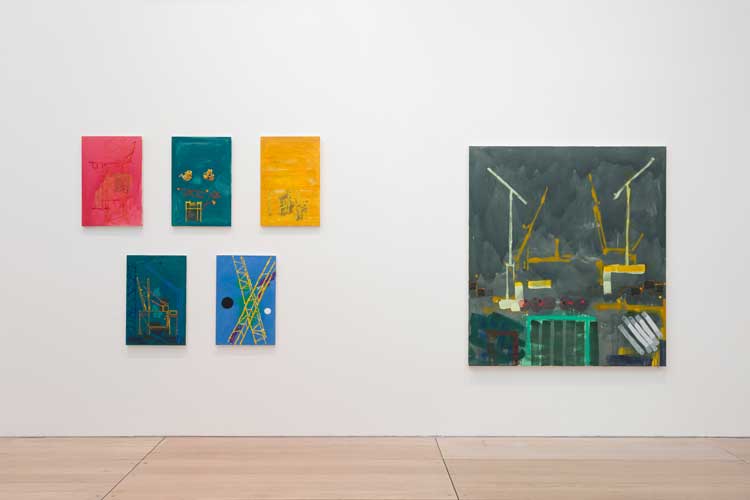 Walking into the first room of Christina Mackie’s solo exhibition at Goldsmiths Centre for Contemporary Art is like entering a shipbuilding yard – all at once you are surrounded by towering cranes. These are a suite of paintings, some new and some dating back to 1985, when her work, although still decorated with her trademark “splats”, was a lot heavier and more loaded with paint. In fact, the works in this room, which make up an installation called Dissolve, are hung according to their material weight, with the upper row comprising diaphanous, yet still industrial, watercolours.