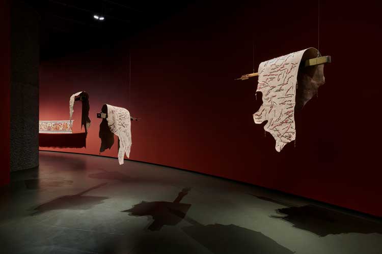 But more on that shortly. The exhibition’s prologue gives little hint of what is to follow. Sasmita has hung five cow hides from the ceiling. They rest on antique wooden pillars, with elaborately carved and painted heads. They look like divine arrows, thrown by a titan. Sasmita has threaded these hides with rows of red and green beads, which run across them like mountains on a map, or caterpillars across a boulder. They are arranged with no obvious rhyme or reason, but encourage you to look for one. Many of the rows feature larger, pearl-sized beads that glimmer and glow. Coin-like tokens hang off the skins’ sides. It feels like an offering, gifted in thanks for the torrent of inspiration that follows.
