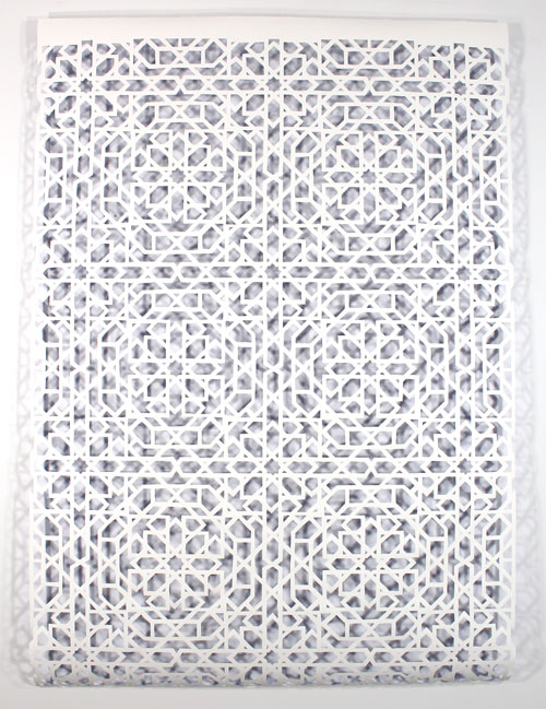 Crossing the Line 2 included several exhibitions. Location, curated by Barberis at the Jam Jar gallery, comprised 34 works by invited international artists and the conference speakers, and On Location included student works from the New York-based Rome Art Program, founded and directed by Carole Robb. The results of workshops held before the conference were exhibited on the AUD campus. Geometric Aljamia: A Cultural Transliteration,a group exhibition featuring works by Reni Gower and Jorge Benitez, both of Virginia Commonwealth University (VCU), Richmond, US, Julia Townsend and visiting artists from Afghanistan, was held at Total Arts Gallery, Dubai. The large paper-cuts by Gower dominated the space, remarkably evocative abstract works that resonated with a spiritual power. The exhibition explores the connections between Europe, the Mediterranean basin and the Middle East by addressing the fundamental geometry embedded in 2D art. Aljamia is the adaptation of the Arabic script to transcribe texts in European languages. Aljamia manuscripts have long played a significant role in preserving Islam and the Arabic language in the west. By understanding the visual arts as a transliteration of one form of thinking to another, the exhibition revisits the continuing impact of Islamic art, science and philosophy in the modern world.