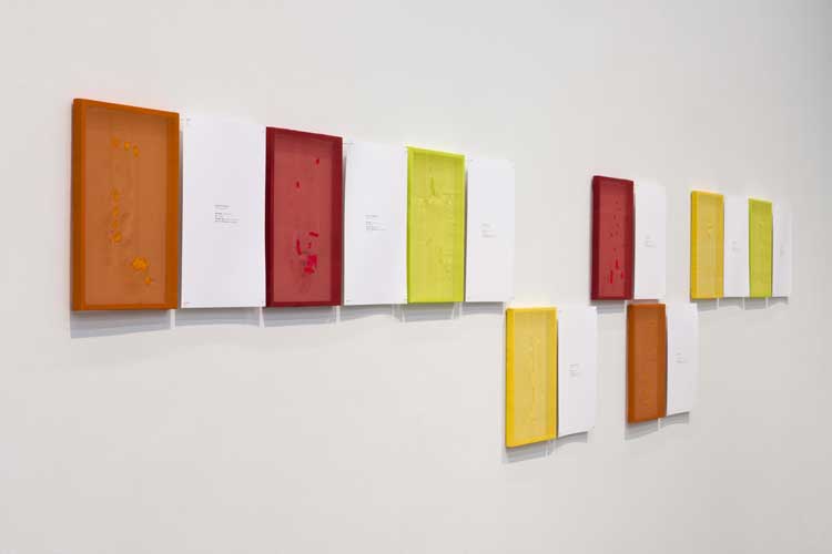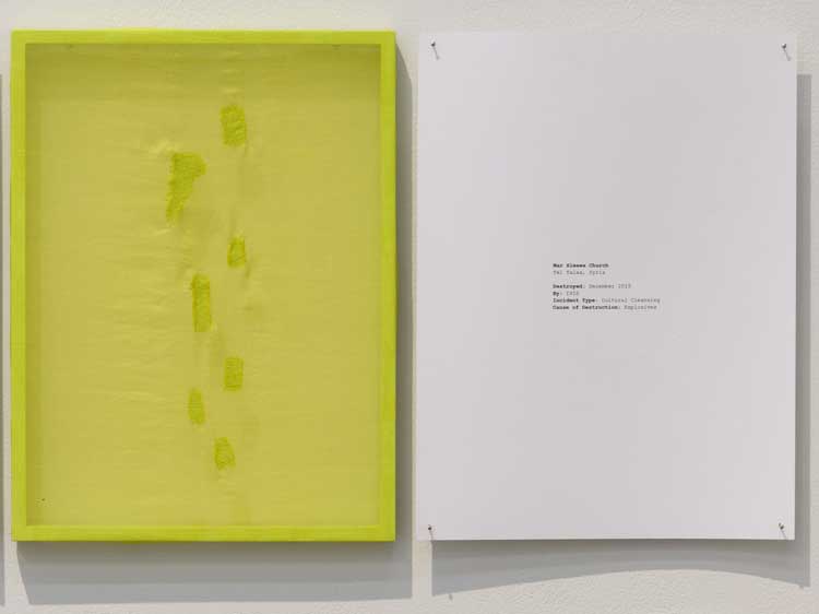 These poignant works are each hung with a descriptive note explaining details of the incident concerned. A darned rectangle of silk, dyed blood-red with medicinal herbs, represents the destruction of Saint Takla Monastery in Maaloula, which, the accompanying artist’s text states, was the subject of an al-Qaida attack in April 2012, such that arson, vandalism and looting left it destroyed. A similar piece of darned lime-green silk represents the explosion when Mar Odisho Church in Tel Tal was blown up by Isis in an act of cultural cleansing in April 2015. Further cultural cleansing is evidenced in an acid-yellow piece of silk representing the explosion when the al-Nusra Front destroyed the Mausoleum of Imam Nawawi in Nawa, Deraa, in 2015. The litany of destruction continues. The Bab al- Nasr area in Aleppo was destroyed by fire and shelling in July 2014 during the civil war. The accompanying orange silk, with its multiple tears and repairs, represents this tragedy. Another stretched section of orange silk, repaired in eight places this time, represents another tragic event, that of the cultural cleansing of Mar Yun an Church in Tel Jazira in Syria in December 2015, again by Isis. These are just some of the series of colourful panels, ruptured and repaired in act of mourning by the artist.