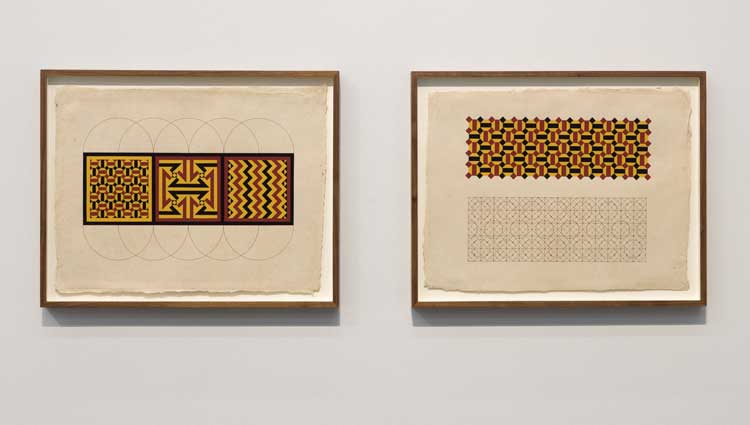 Across two adjacent gallery walls are six framed studies of a variety of Ottoman-influenced patterns painted in natural pigments on handmade cotton rag paper from Jaipur in India. The studies accompany Standing by the Ruins III (2025), Awartani’s latest iteration of such floor-based works. It recreates the detailed Ottoman-influenced floor design from Gaza’s Hammam al-Sammara – one of the oldest bathhouses in the region and now destroyed by Israeli bombardment. Each individual brick in the installation was made in a longstanding collaboration with craftsmen who work with adobe restoration in Riyadh, Saudi Arabia. The handmade bricks are dried in the sun, but in Awartani’s installation the binding agent is omitted, suffusing the work with both strength and fragility.