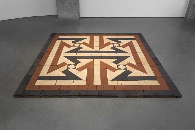 Standing by the Ruins, named after an ongoing series of floor installations and paintings, presents the viewer with three compelling themes – remembrance, healing and forgetting. For Awartani, the process and practice of making is equally as important as the finished work and so traditional crafts techniques, such as adobe building methods and darning, are brought to the fore through her work with skilled artisans and locally sourced materials. The historical and visual references to Islamic and Arab art-making techniques mean that Awartani’s contemporary and politically charged practice remains rooted in traditional artisanal craft, both techniques and materials, meaning its relevance to cultural histories is never in question.