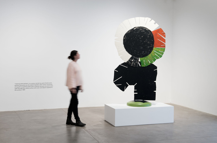 Many of Smith’s untitled spray paintings contain geometric shapes coloured with spatters of red, black or blue paint. Other, more involved canvases venture into painterly territory with bold forms embellished by brush marks. These are echoed by Smith’s last painted sculptures, such as the nearby Rebecca Circle (1961), a large, flower-like construction cut from steel sheets and coloured red, green and yellow. Seeing these pieces displayed together not only reveals how different bodies of work informed each other, but how freely Smith moved between mediums.