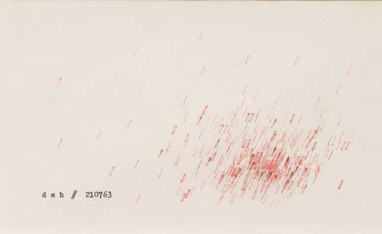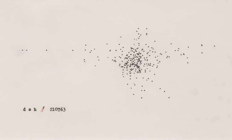 Two of the most exquisite works included are also the earliest; both are untitled and dated 21.6.1963. They communicate a minimalist purity of message, as if having emerged directly in one sitting from Houédard’s close engagement with the non-lexical properties of the typewriter he was using. One has been positioned like an Orthodox icon in an alcove to the left of a fireplace in the front room of the gallery. It looks like a cascade of thin red raindrops with a few tiny spots of soot. The other, dated the same day, shows a graphic constellation of small black dots, as if Houédard had gone wild on the punctuation point. Both are beautifully configured against a breadth of negative space.