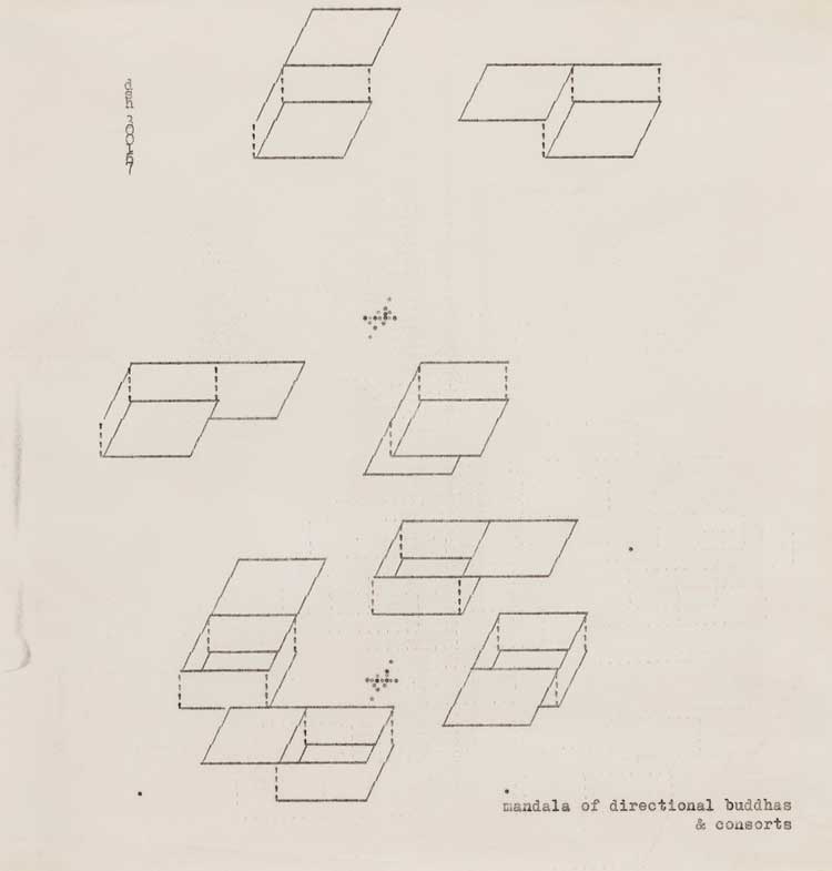 Dom Sylvester Houédard, mandala of directional buddhas & consorts, 1967. Typed page, 21.2 x 20.4 cm (8 3/8 x 8 in). Image courtesy of Lisson Gallery.