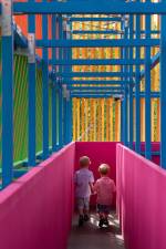 The zingy tones of pink, yellow, red, orange, blue and green may seem radical enough, but the wooden structure itself is highly innovative, featuring thousands of pieces of timber, all of the same size, displayed with their joints visible to reveal the craftsmanship and structural logic.