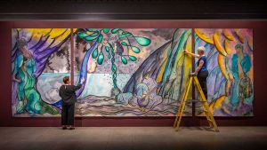 This is not, of course, the first time that Glasgow’s heritage in carpet manufacturing has fed into the arts. John Byrne’s The Slab Boys trilogy, begun in 1978, examined life in the slab room (where colours were mixed and ground) at the fictional A F Stobo Carpet Manufacturers in Paisley in the 1950s. Byrne worked at A F Stoddard and Company Ltd before and after he attended Glasgow School of Art (1958-63) and his experience there was the impetus for the plays.