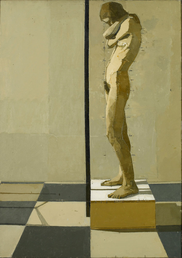 Uglow’s analytical precision was partly inherited from the exacting, almost scientific methods of observation practised by William Coldstream, under whom he studied at the Camberwell School of Art and then Slade School of Art in London from 1948-54. Paintings by Coldstream and other artists who either taught or influenced the young painter – including Victor Pasmore, Claude Rogers, Paul Cézanne and Alberto Giacometti – are displayed in the exhibition’s first room alongside Uglow’s early canvas The Musicians (1953). This Arcadian scene, painted during his final year at the Slade, and clearly indebted to Piero della Francesca, depicts naked youths singing and playing instruments. Showing us his workings, Uglow leaves visible the grids used in the transfer of his drawing to canvas – an idiosyncrasy of his paintings, which are typically littered with distinctive measuring marks and other signs of their making.