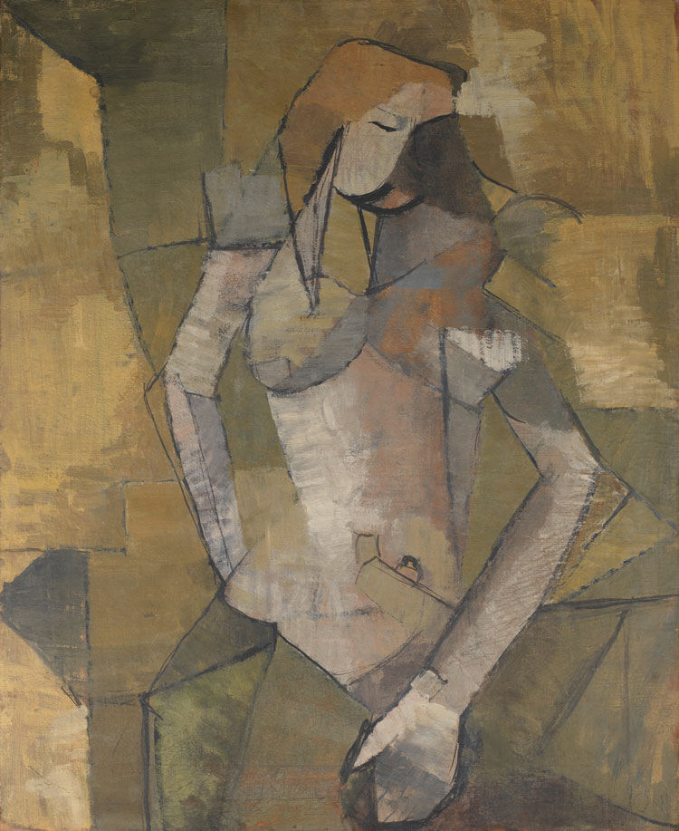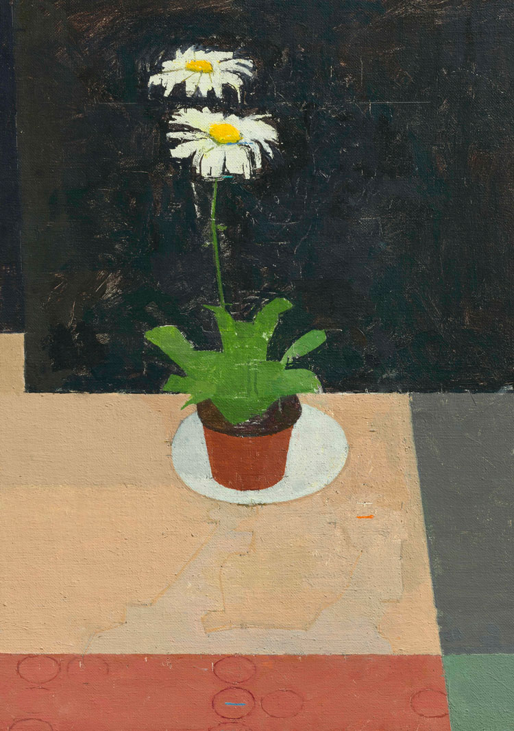A standout work in the final room is Still Life with Honeysuckle (1968), an apparently straightforward painting of a single honeysuckle stem in a jar set on a white tabletop against a cerulean-blue wall. It is, in fact, a complex pictorial game. Few clues are given regarding depth, which creates an indiscernible sense of space. The flower’s yellow and pink petals seem to exist on the same plane as the back wall and their form is echoed by their container’s decoration. A single shadow on the table helps make sense of the scene, as does the top of the container, which disturbs the horizontal meeting point of wall and table. It is a prime example of Uglow’s fascination with modernist flatness, as well as his mastery as a colourist.