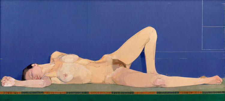 Uglow typically posed his female sitters in awkward positions that emphasised the geometry of their bodies. A notable example in a room dedicated to his large-scale nudes is The Diagonal (1971-77), a root-two rectangle in which a naked young woman perches uncomfortably on a chair, her body stretched to form an elegant diagonal line. Evidently, posing for Uglow was physically demanding and many models abandoned the job, including the first sitter for this painting, who walked out after six weeks. While three models were involved in Three in One (1967-68), in which the composite figure lies sprawled on a blue mat, others remained committed to the process from beginning to end.