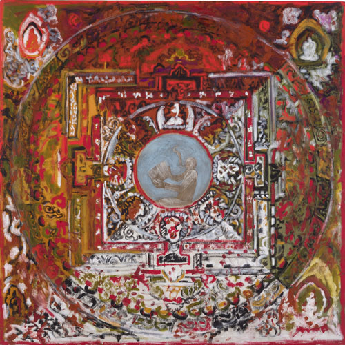 As sage or mediator Clemente here asserts opposites such as the sublime and the ridiculous as a plea to break down artistic and religious hierarchies. In contrast to the muted palette of the 14 large paintings in the Blain Southern exhibition, the colours in the mandala paintings are both richer and deeper, and have the quality of Oriental carpets, or magical gardens. The symbolic configuration of the mandala, in meditation (or viewer in the case of the art works), enables access to deeper levels of consciousness. Clemente’s work leads the viewer to a plane of greater meaning, enabling a mystical oneness with creation. Unlike Biblical narrative, which informs the strict liturgy of Roman Catholicism, the mandala enables the cosmos to be contemplated in its manifold forms. In psychoanalysis, Carl Jung viewed the mandala as, a representation of the unconscious self. He believed that paintings of the mandala enabled the identification of mental disorders; in Jungian terms the mandala is the symbol of the perpetual effort to reunify the self.