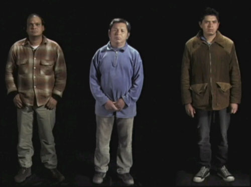 Hill used a similar technique for Viewer (1996). Here, 17 individual life-sized images of silent standing men, placed together in a line, seem to observe what is happening in the room. Thus Hill places the viewer within the work via a device that Diego Velasquez inaugurated in the 17th century with his Las Meninas. Hill's choice of title, Viewer, designates viewer and viewed as a unified entity. While Hill's audience considers the work, many will find that the act of facing the figures shown in the work as they look back is, frankly, disconcerting.