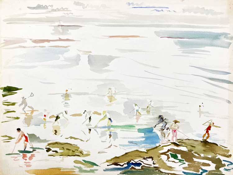 Hélène de Beauvoir. Rice Field Workers, c1940s. Watercolour on paper. 38 x 51.2 cm. Courtesy Amar Gallery, © APP, Ute Achhammer.