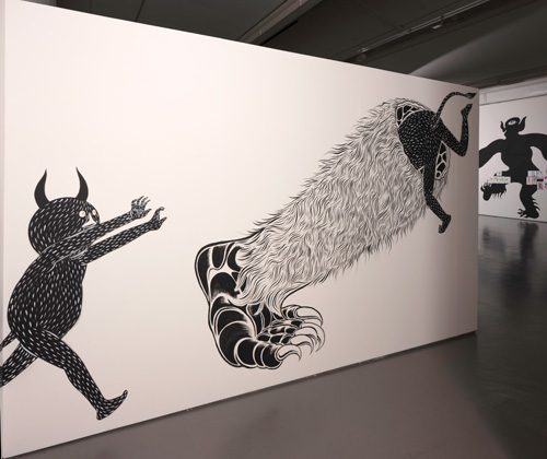 The first monster emerges boldly from red and white walls, so large that only his top half pops up from the floor. He bears teeth and a formidable glare, his body made of patterns that seem biological in origin – brain-like, cell-like, nervy. A surplus of eyes in this creature begins something of a theme, with stray and dislocated eyes popping up throughout the exhibition. While the first monster could have sprung from a comic book, the second monster – black and furry, with two black horns and a devilish tail, bears the style of a younger children’s book, with the simple strands of fur and eyes popping out in fright. It scampers playfully along the wall, as if being chased by another, as yet unseen, creature.
