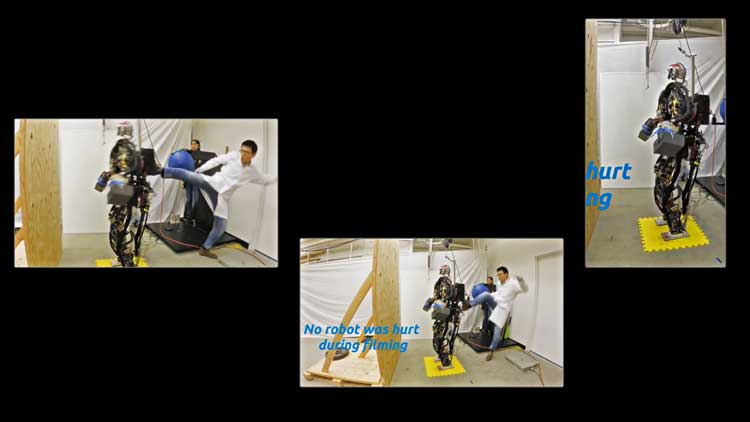This earlier work, all smiling and colloquial as it bombards the senses, remains as overwhelming today as when I first saw it at Skulptur Projekte Münster in 2017, where it was housed inside a brutalist bank, or in 2024 when I encountered it again inside the haunted baroque sala of the Castello di Rivoli. It is named for the five most common words in the English language pop charts of the 2010s. It features two video works. One, presented over three screens, homes in on robots used to save people in disaster zones. What we see, however, are scientists appearing to physically abuse their androids, in the name of training. The metallic backdrop becomes a sort of militarised athletics ground.